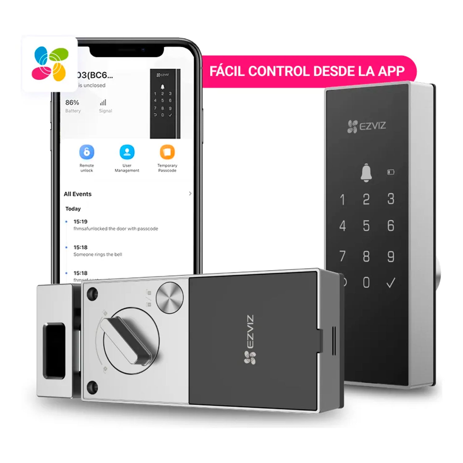 Huella digital, app EZVIZ remota, contraseña temporal, tarjeta NFC o llave mecánica de emergencia: elige el más conveniente sin depender de un solo método. Genera códigos de un solo uso para repartidores o invitados, revocables desde tu smartphone en cualquier momento.