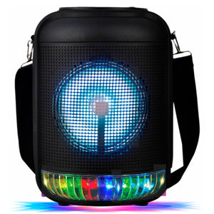 Este parlante cuenta con reproductor MP3, radio FM, entrada para micrófono y ranura para tarjeta MicroSD, brindando múltiples opciones para reproducir tu música favorita. Su función de karaoke te permite cantar y animar cualquier evento, convirtiendo cada reunión en un espectáculo.